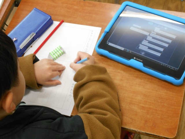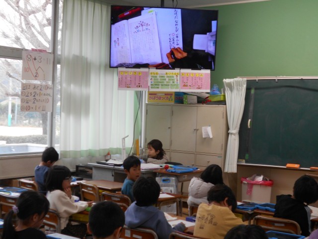 一年間の思い出をふりかえり、タブレットの思考ツールを参考にし、作文を書いていました。書くマスなどは、テレビに映した先生の書く様子をお手本にしていました。