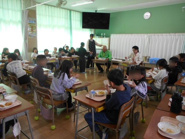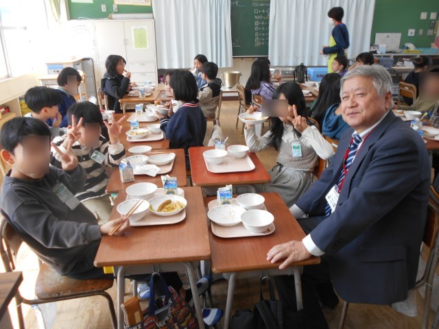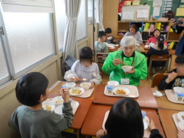 感謝の会終了後、学校運営協議会の委員さん方も加わり、招待給食を行いました。一緒に給食をいただきながら、楽しい時間を過ごしました。見守りをしてくださっている方からは、「A君は、朝の登校しているときの顔と比べて、学校では、とても楽しそうにしているから安心しました。」とおっしゃっていました。子どもたちを見守ってくださっていることに、ありがたいと心から感謝しています。