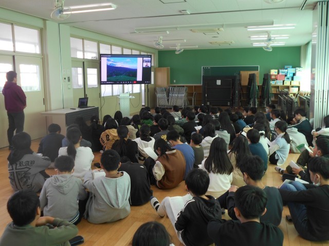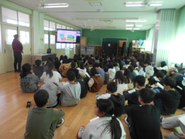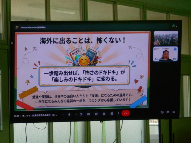ウガンダ在住の方とオンラインで中継を結び、現在のお仕事や生活の様子について、リアルタイムにお話を聞きました。海外に出て、いろいろな体験をすることが、視野を広げ、世界が広がると教えてただきました。子どもたちが、積極的に質問をして、最後に「仕事は、自分のためにすると思っていたが、人の役に立つため、100年後の未来のために働くことが素敵だと思いました」と感想を伝えました。素敵な経験になりました。