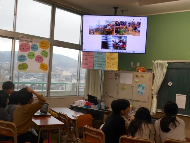 リモートで各教室をつなぎ、クイズ大会で盛り上がっていました。チームで、協力して考えています!