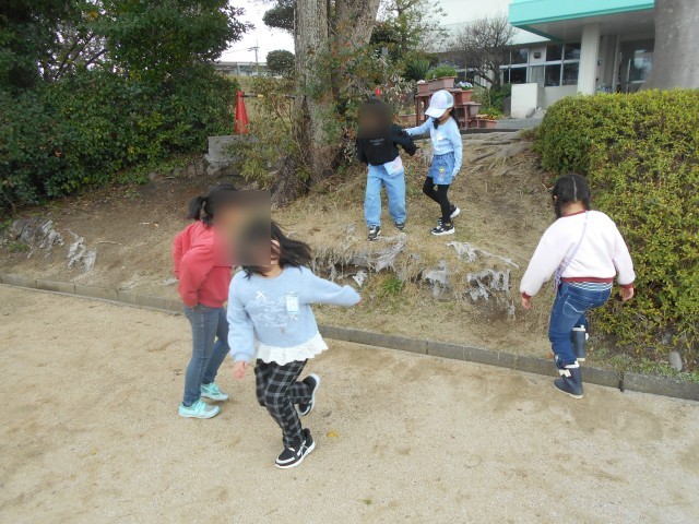 だんごのように集まって何をしているのかを思い、近づいてみるとみんなで足をだして、鬼はだれかな・・・のように指を順にさして決めていました。昔はじゃんけんだったのに・・・時代によって鬼の決め方が違うのですね・・・