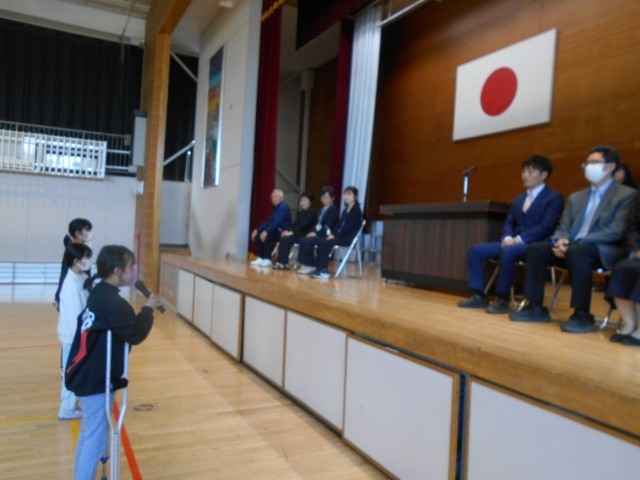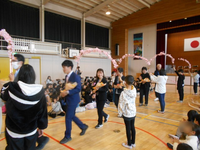 9名の先生方とのお別れをしました。児童代表の挨拶や花束贈呈があり、全員で校歌をうたって、お見送りしました。先生方ありがとうございました。