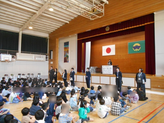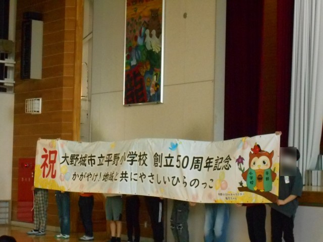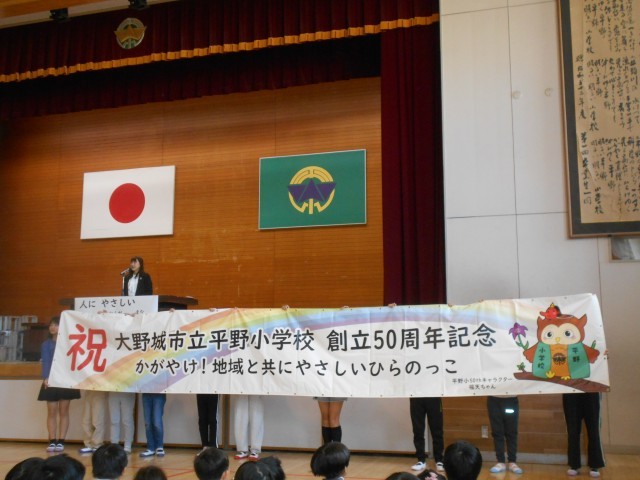 50周年記念イヤーのスタートとして、横断幕を披露しました。子どもたちの目がキラキラ輝いていました。校長から、記念に残る楽しい1年にすることと、今年の目標として「人にやさしいひらのっこ」「自分で考え学ぶひらのっこ」「進んで動くひらのっこ」を伝え、「考えてやってみよう!」という合言葉について話しました。その後、担任紹介をしました。