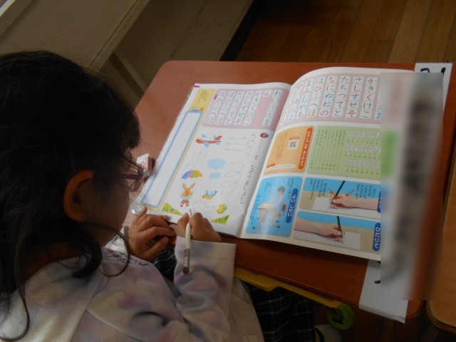 早速、1年生はえんぴつをもち、ぐるぐるを書いたり、線を書いたりしていました。集中して頑張っていました。