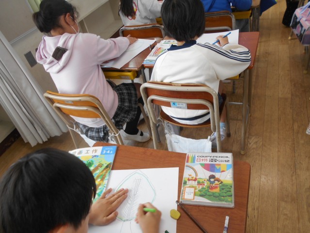 画用紙に、自分の好きな木を描いていました。葉っぱ一枚一枚描いたり、太い幹を描いたりと一人一人が違って、のびのびと描いていました。
