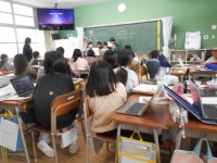各クラスで学級懇談会が開かれている時間,子どもたちは体育館に集まり,「交通安全教室」として,交通安全についてのDVD教材を鑑賞しました。