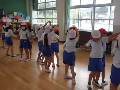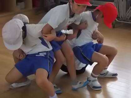 2人組などで,背中合わせで立ったり,背中に乗せたり,「なべなべそこぬけ」をしたりして,仲良く体操をしています。少しずつ,息が合ってきました。