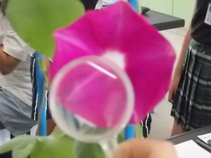 受粉した朝顔の花の様子(おしべ・めしべ・花粉)を虫めがねで観察しています。受粉前後の変化について調べています。