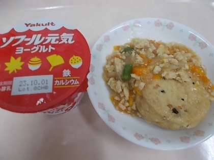 今日の献立は,玄米ごはん・がんものふくめ煮・ひき肉あんかけ・けんちん汁・ヨーグルト・牛乳です。鉄(がんもどき)やカルシウム(ヨーグルト)を多く含む給食献立です。