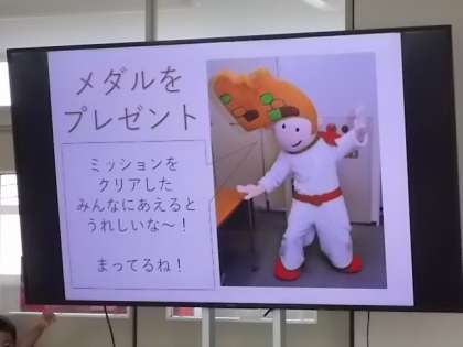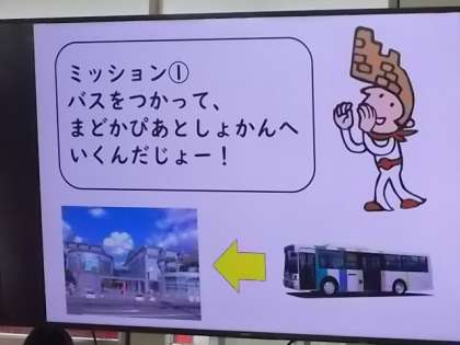 「大野ジョー君」からのミッションは3つ。 (1)バスでまどかピア図書館へ来ること (2)図書館を見学すること (3)図書館で読み聞かせや工作をすること この3つをクリアすると,メダルがもらえます。