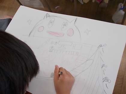 「ふしぎな乗り物」というテーマで,それぞれがアイディアスケッチをもとに下書きしています。自由な発想で,おもしろい乗り物が描けています。