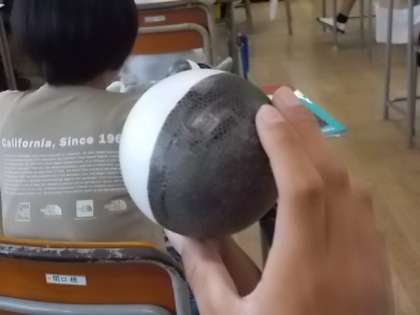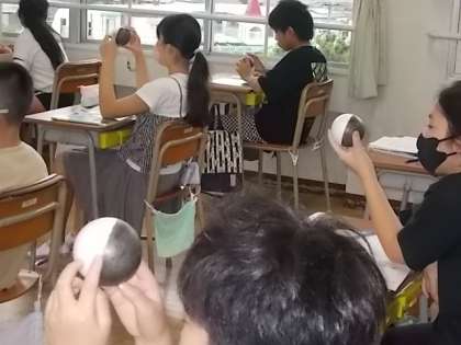 新月,半月,三日月,満月。月の形が変わって見える理由について,白と黒の2色に塗り分けられた球体を観察して,調べています。