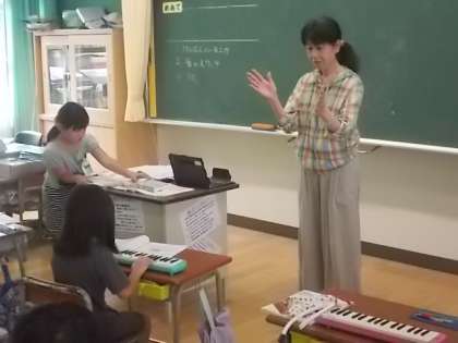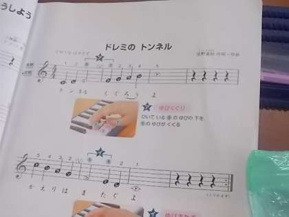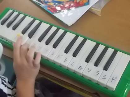 「ドレミファソラシド ドシラソファミレド」 「ドレミのトンネル」のメロディーを,一人ずつ順番に鍵盤ハーモニカで演奏しています。指使いも上手です。