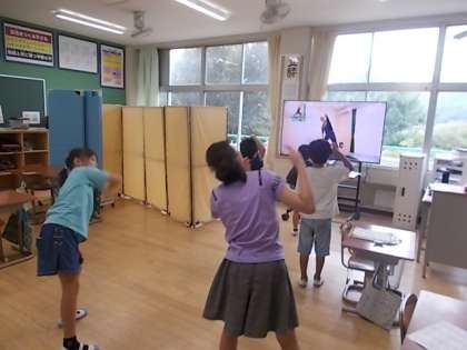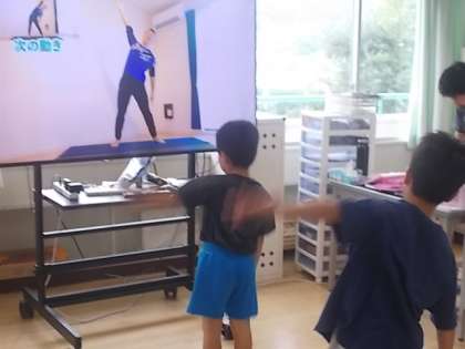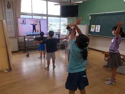 わかくさ学級の子どもたちが,朝の体操をしています。朝から体を動かすと,脳も活性化され,集中力アップにもつながります。