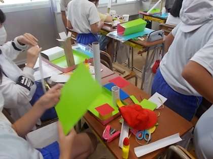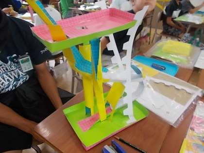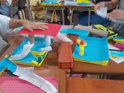 ビー玉が転がるように,立体の工作づくりをしています。ビー玉を試しに転がしながら,何度も試行錯誤を繰り返しています。