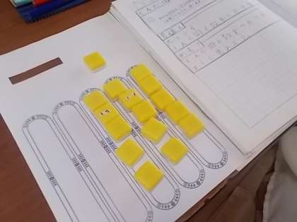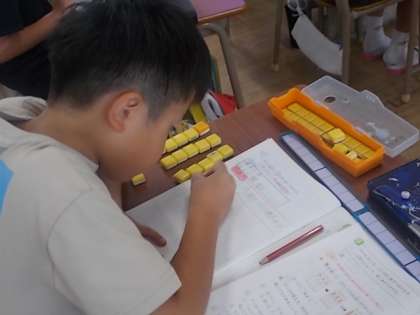 ブロックを操作しながら,あまりのあるわり算の答えについて考えています。操作を通して,計算方法の意味をとらえさせていきます。
