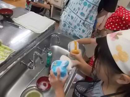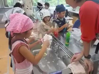 たくさんの保護者の皆様のご協力のもと,生活科「おしごと大さくせん」の学習をしました。これは「しゅっきあらい大さくせん」の様子です。
