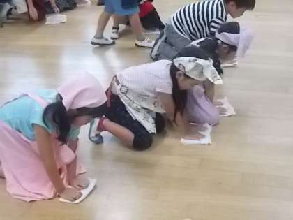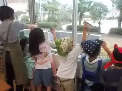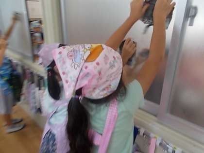 これは「おそうじ大さくせん」の様子です。水で濡らした新聞紙を使って,窓をピッカピカに磨いています。