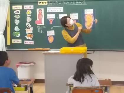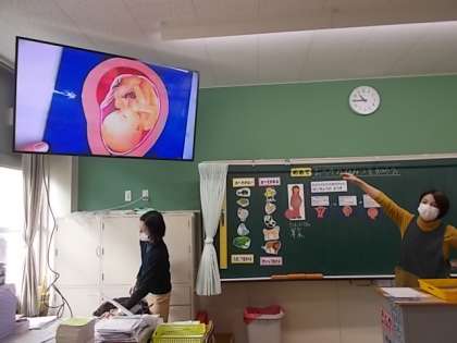 2年生は、養護教諭の桐谷先生と一緒に「おへそのひみつを知ろう」という学習を行いました。お母さんのおなかの中で、赤ちゃんがどのように成長していくのか?実際の大きさを物差しを使って図ったり、テレビに映像を映し出して、赤ちゃんの成長の様子を確認していきました。