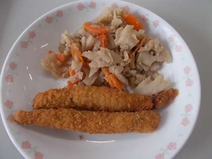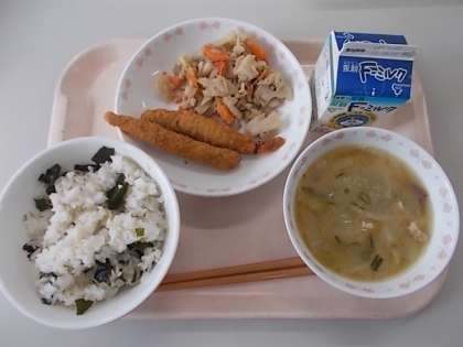 今日の給食は、季節の食べもの「れんこん」を味わおうがテーマでした。献立内容は、、麦ご飯、ししゃもフライ、れんこんのきんぴら、さつま汁、わかめのさっと煮です。今日もおいしく頂きました。