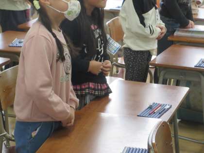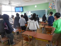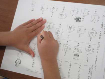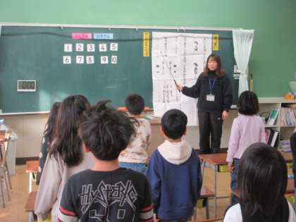 平野タイムに,1年生の元気な声が聞こえています。おなかに手をあてて発声したり,先生が指した二つの数字を足したり引いたり,工夫した活動が行われています。発声の後は,集中して漢字の書き取り練習です。