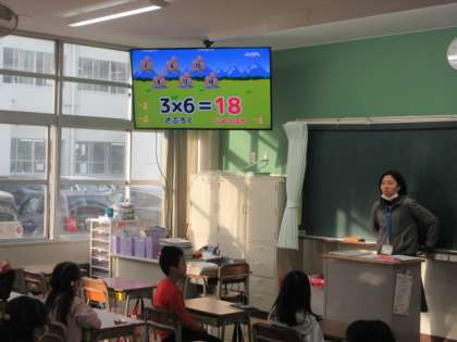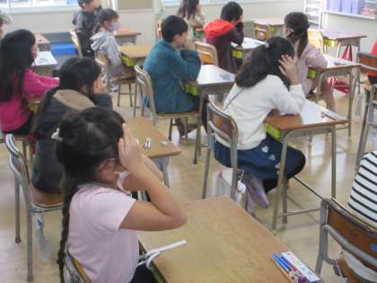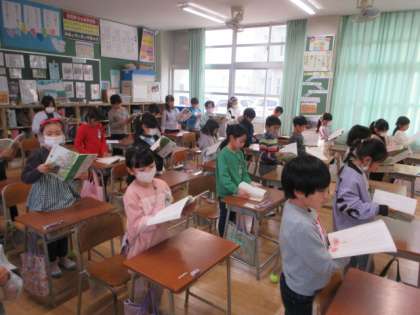 2年生は,平野タイムに,国語の教科書の音読をしたり,曲に合わせて九九を唱えたりしています。画面を見ないでも九九を言える子どもは,目に手をあてて挑戦しています。