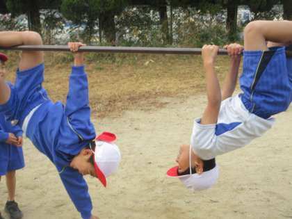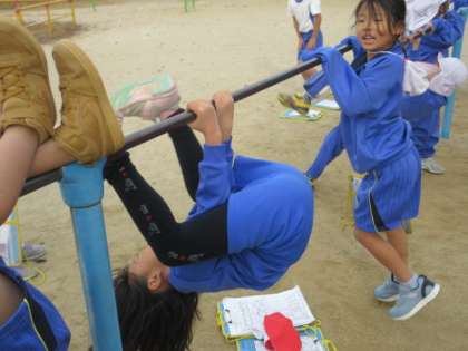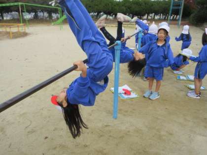今日も,1年生が,鉄棒遊びを頑張っています。つばめ・こうもり・ふとんほし・だるまさん・地球周り・ぶたの丸焼きなど,たくさんの技に挑戦です。中には,逆上がりが上手な子どももいます。
