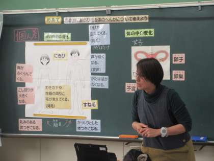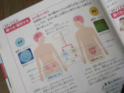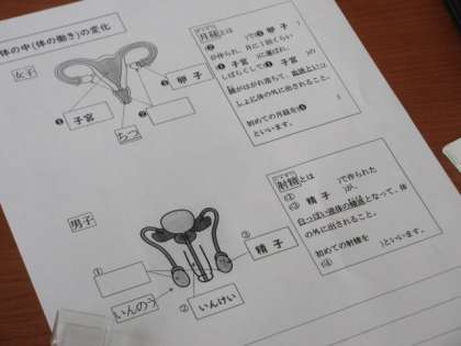 男性や女性の体の働きや変化についても学びました。この写真は,子どもたちが学んだ保健の教科書や学習プリントです。家庭でも,親子で,性について話すきっかけにして下さい。