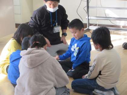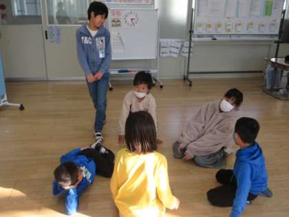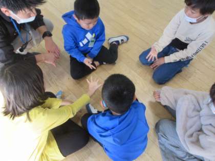 わかくさ学級の子どもたちが,「ハンターゲーム」をしています。一人の子どもが動いた動作をその他の子どもが真似ます。そして,誰が動きはじめなのかを探します。「震源地ゲーム」とも言いますね。