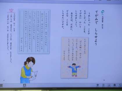 うれしかったこと,たのしかったことなどを手紙に書いて,知らせたい人に知らせる学習です。誰に,どんなことを知らせたいかを話し合っています。子どもたちは,知らせたいことが,たくさんあるようです。