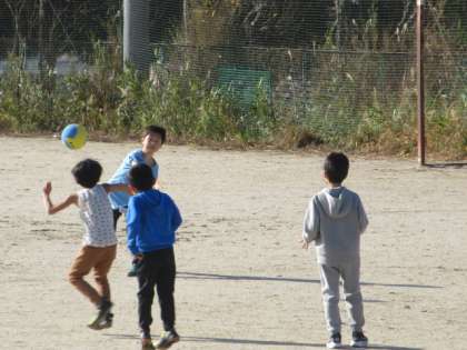 快晴のもと,わかくさ学級の子どもたちが,ドッジボールをしています。高学年,中学年,低学年の子どもたちが一緒に活動し,交流を深めています。
