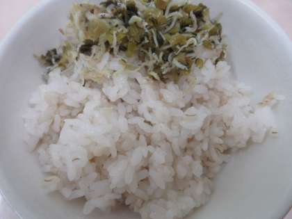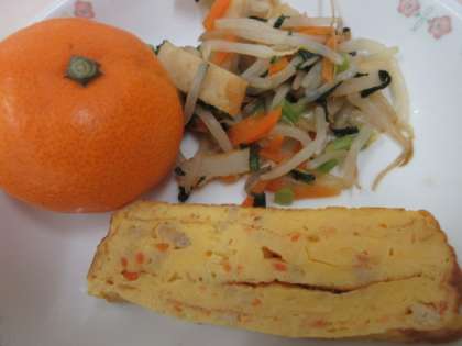 今日の献立は,麦ごはん・高菜の油炒め・卵焼き・野菜炒め・ごま入り味噌汁・みかん・牛乳です。
