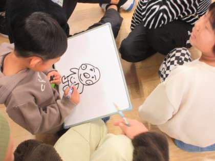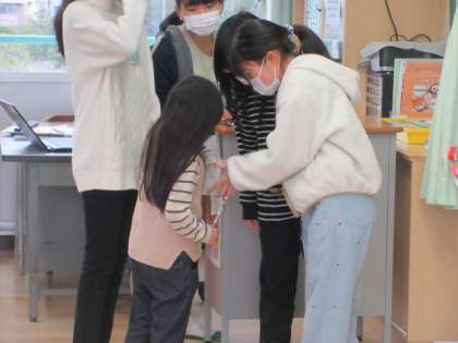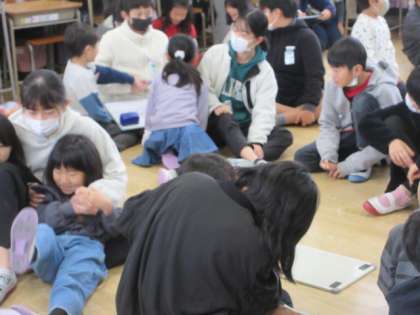 1年1組と6年1組の交流会の様子です。お絵描き伝言ゲームやビンゴゲーム,なぞなぞ大会をしています。「アンパンマン」のお題で,絵で上手に伝言できていますね。
