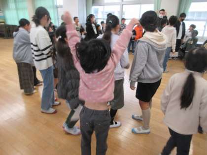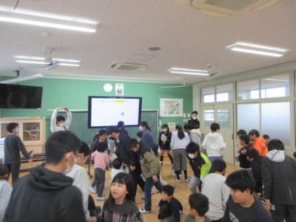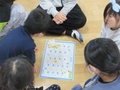 1年3組と6年3組の交流会の様子です。すごろくゲームや○×クイズ大会をしています。クイズに正解すると,1年生は大喜びです。