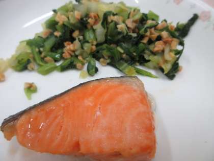 今日の献立は,玉ねぎの味噌汁・鮭の塩焼き・小松菜のアーモンド和え・味付け海苔・麦ごはん・牛乳です。
