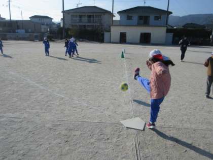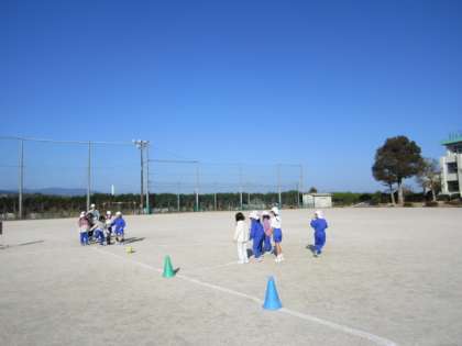 今日は,雲一つ見えないほど,快晴です。青空のもと,キックベースボールの試合を楽しんでいます。