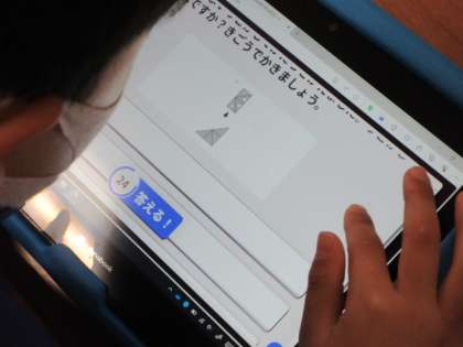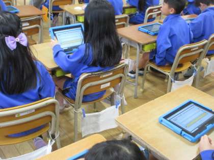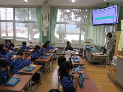 ICT支援員の山下先生の指導で,1年生で習った学習の復習問題を,クイズ形式で答えています。正解すると,大きな歓声があがります。