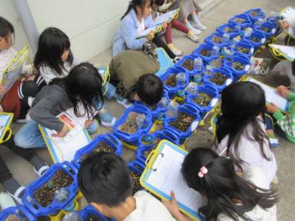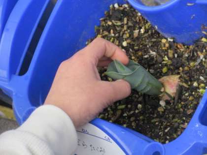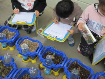秋に植えた一人一鉢のチューリップの球根が,すくすくと育っています。もうすぐ,きれいなかわいい花を咲かせてくれるでしょう。