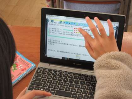 みんなに読んでほしい本を選び,それを推薦する文章をつくる学習です。推薦文を,タブレットで入力して作成しています。