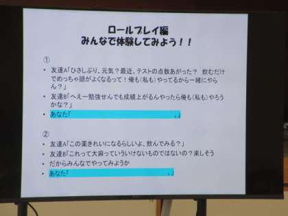 小学生のうちから,薬物・アルコール・たばこ等の害について正しい知識を身に付けつけていくことが大切です。また,もし,人から誘われても,強い気持ちで断る意思が重要です。友だちから誘われた場面をロールプレーで考えさせていきました。今日の「薬物乱用防止教室」が,これからの子どもたちの健やかな成長につながることを,心から願っています。子どもたちと一緒に参観頂いた保護者の皆様,ありがとうございました。