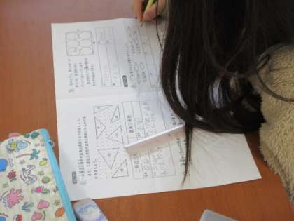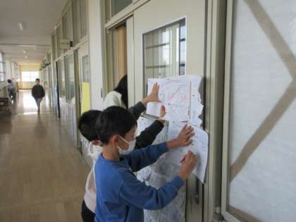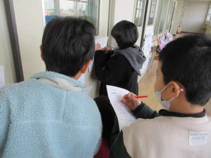 3年生で習った算数の復習プリントに意欲的に取り組んでいます。廊下にはられた解答のところへ行き,答え合わせをしています。