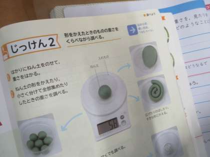同じ量の粘土を,丸めたり,平ぺったくつぶしたり,細長くひも状にしたりすると,全体の重さは,どうなるでしょう。