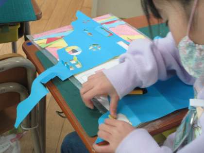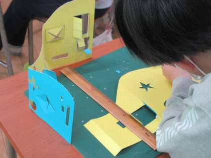 カッターを使って色厚紙を切り,「まどのあるたてもの」をつくっています。上手にカッターを使い,たくさんの窓が作れています。