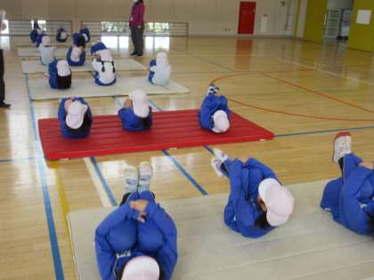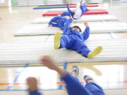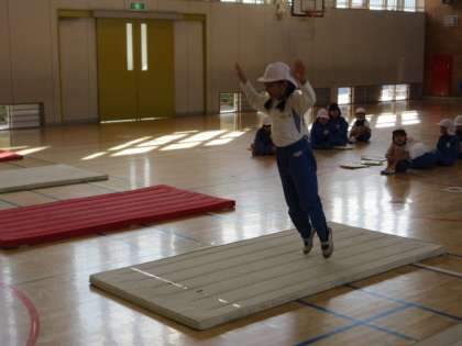 マットで,楽しくあそんでいます。ゆりかご,カエルの足打ち,丸太ころがり,おきあがりこぼし,かわとび,まえころがり,うしろころがり。頑張り表には,楽しそうな技がのっています。