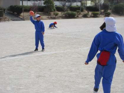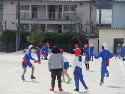 運動場で,フラッグフットボールのゲームを楽しんでいます。機敏な動き,的確なボール投げやキャッチ,素早い走り,様々な運動技能を必要とするゲームです。