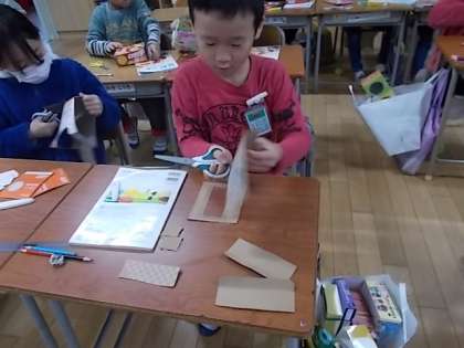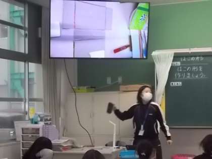 2年生の算数では、「はこの形」を学習しています。2組では導入で大型提示装置に方眼用紙を映し出して箱の構成を学び、1組では実際に決められた辺の長さの箱の形を切り出していました。
