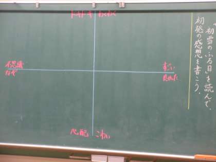 物語文「初雪のふる日」を読んで,初発の感想をまとめています。これから,「ドキドキ・わくわく」「心配・怖い」「すごい・よかった」「不思議・なぞ」の4つの分類で,感想を出し合っていきます。