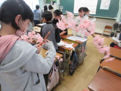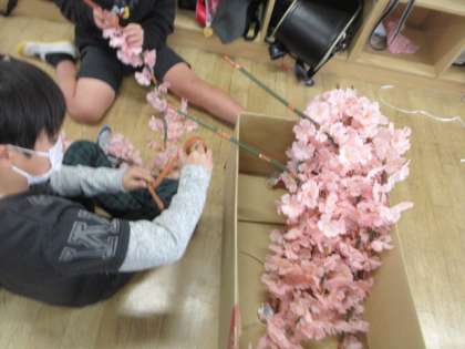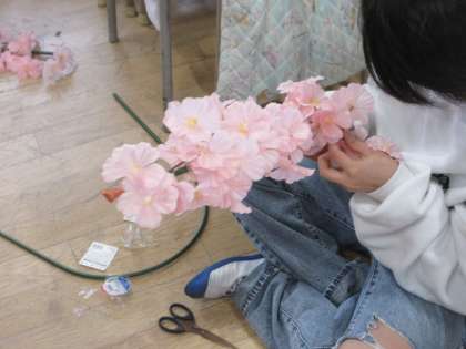 お別れ集会や卒業式,入学式,お迎え集会などで使う,花のアーチ作りをしています。アーチ状の棒に桜の花を結びつけ,きれいな花のアーチが,たくさん出来上がっています。