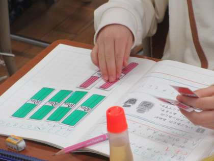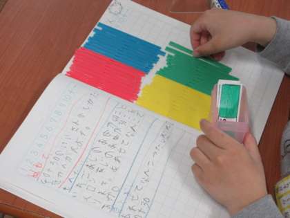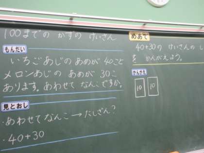 40+30のけいさんの仕方の学習です。実際に数え棒を並べて,考えています。