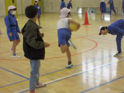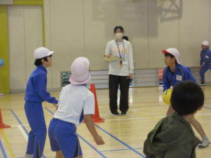 体育館で,やわらかいボールを使って,フラッグフットボールの試合を行っています。試合順を待っている間は,チームでパスの練習です。
